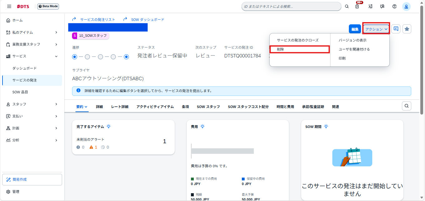 ①削除したい対象のサービスの発注を開いて頂き、右上のアクション > 削除の順に押下