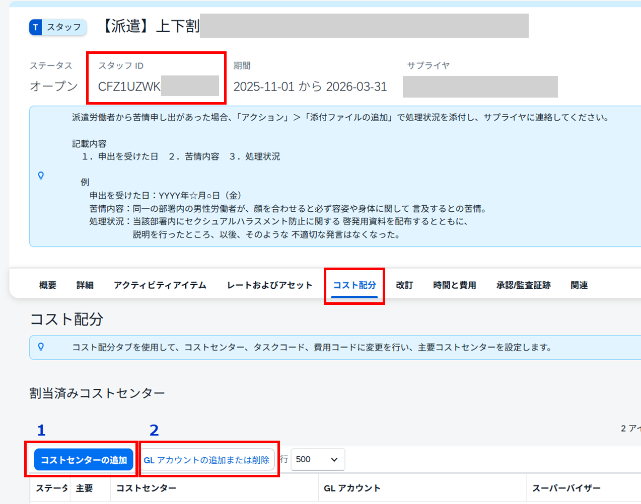 2025年7~9月期間の派遣の作業オーダーを、改訂で10~12月に変更し、コストセンターも変更した。