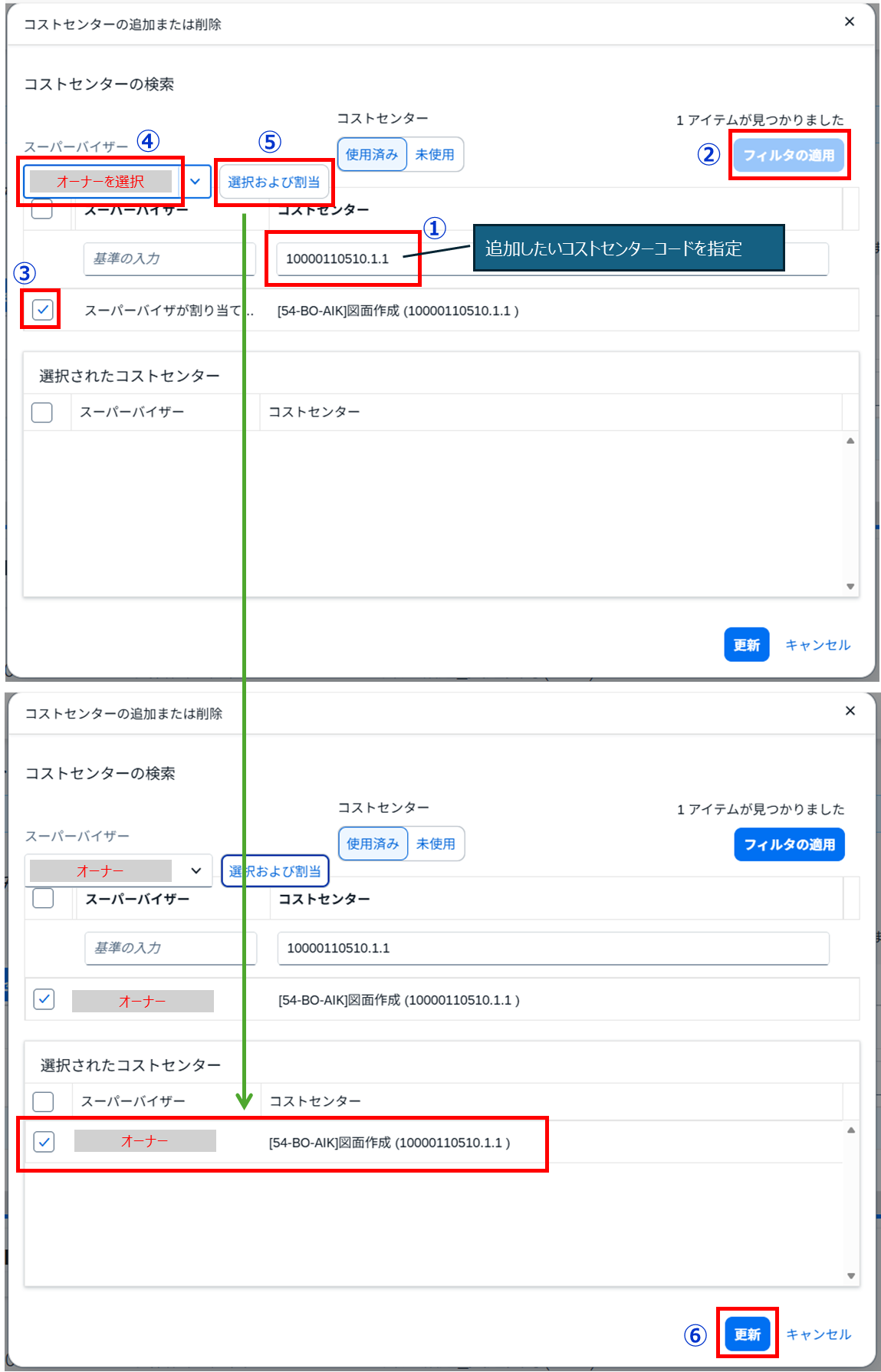 「コスト配分」タブを開き、「コストセンターの追加」ボタンを押下、更新改訂で削除したコストセンターを追加する。(下記画面キャプチャ参照)
